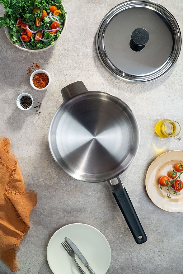 El Sartén Fusión de 24 cm combina diseño, innovación y calidad para transformar cada comida en una experiencia única. Su estructura tricapa garantiza una distribución homogénea del calor en 360°, logrando cocciones parejas y resultados perfectos.